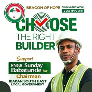 Engr. Sunday Babatunde stands tall with vast experience in engineering and administration. He represents a clear departure from empty promises. He is the best alternative for sustainable growth, structured development, and lasting impact in Ibadan South East Local Government.
